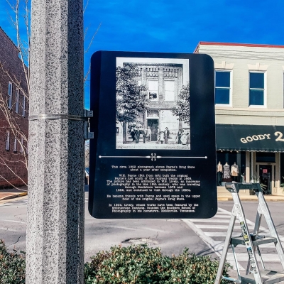 Our Design Committee worked with a local printer, Sign-1-1, to come up with some decorative weather-proof metal plaques that would be hung on the light poles around the square. Each plaque is two-sided with an old photo and caption on each side. The photos were hung closest to the location on the square where they were originally taken. For instance, the photo hanging in front of Payne’s Soda Fountain, the oldest business on the square, is a picture of Payne’s in 1892, about a year after the building was built.